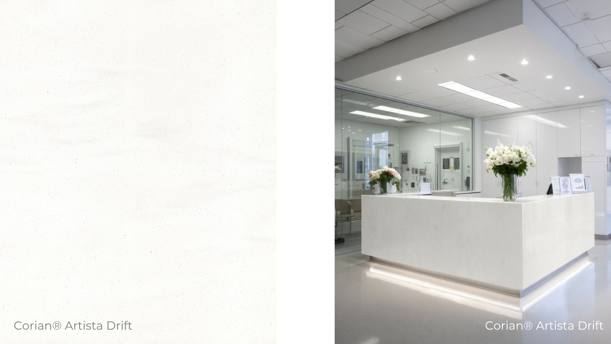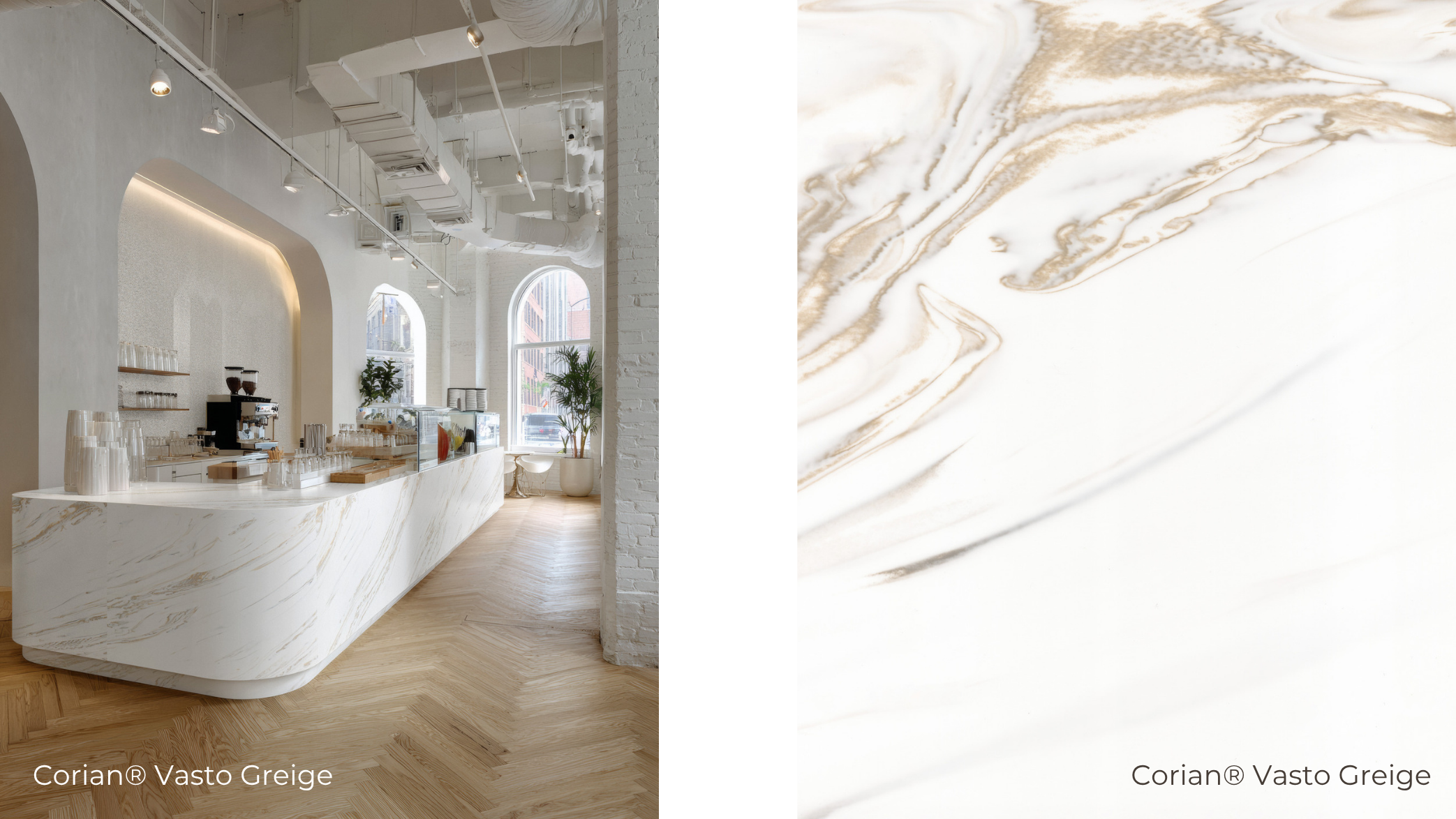 Zdefiniowany przez swoją rozległą głębię wizualną, Corian® Vasto Greige buduje poczucie przestrzeni i ciągłości. Szerokie, płynne użylenie oraz subtelne przejścia między beżem a szarością rozciągają się na tle złamanej bieli, wzmacniając potencjał estetyczny każdej realizacji.