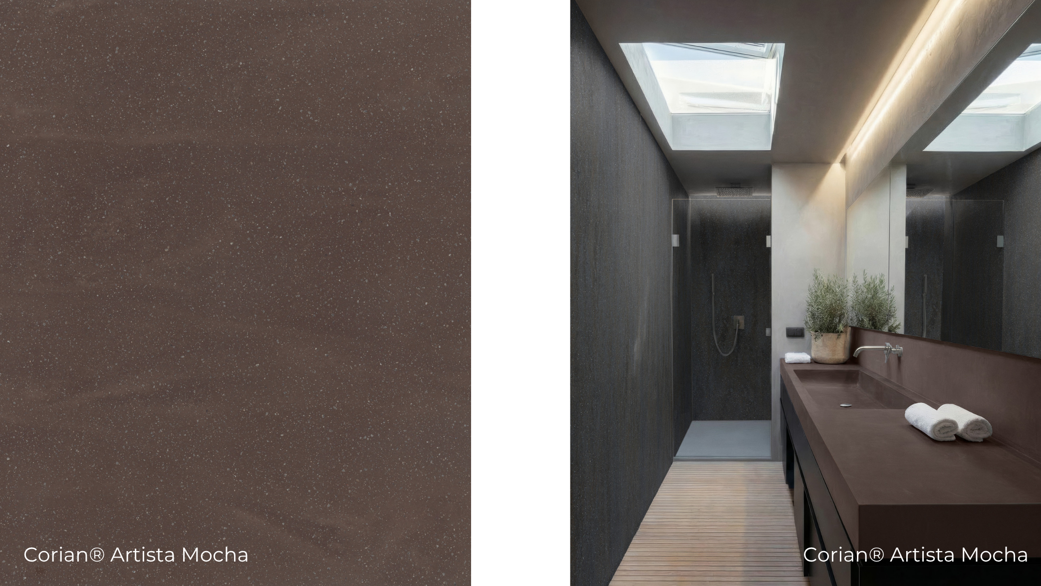 Głęboki brąz przecięty monochromatycznym użyleniem podkreśla naturalną elegancję Corian® Artista Mocha. Dynamiczne, wirujące wzory przywodzą na myśl bogactwo kawy i czekolady, tworząc zmysłową, ciepłą estetykę o wyrafinowanym charakterze.