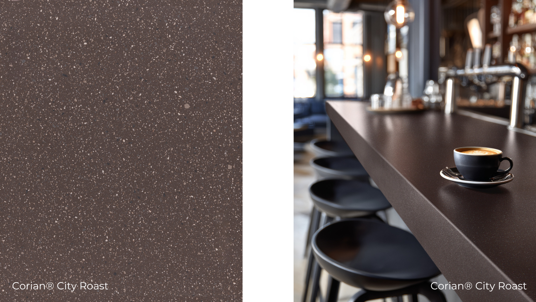 Intensywny i nasycony, z kawowym, brązowym tłem, Corian® City Roast ożywiają subtelne drobinki nawiązujące do energii miejskiego krajobrazu. To ponadczasowa estetyka, która w naturalny sposób łączy harmonię i wyrafinowanie w każdej przestrzeni projektowej.