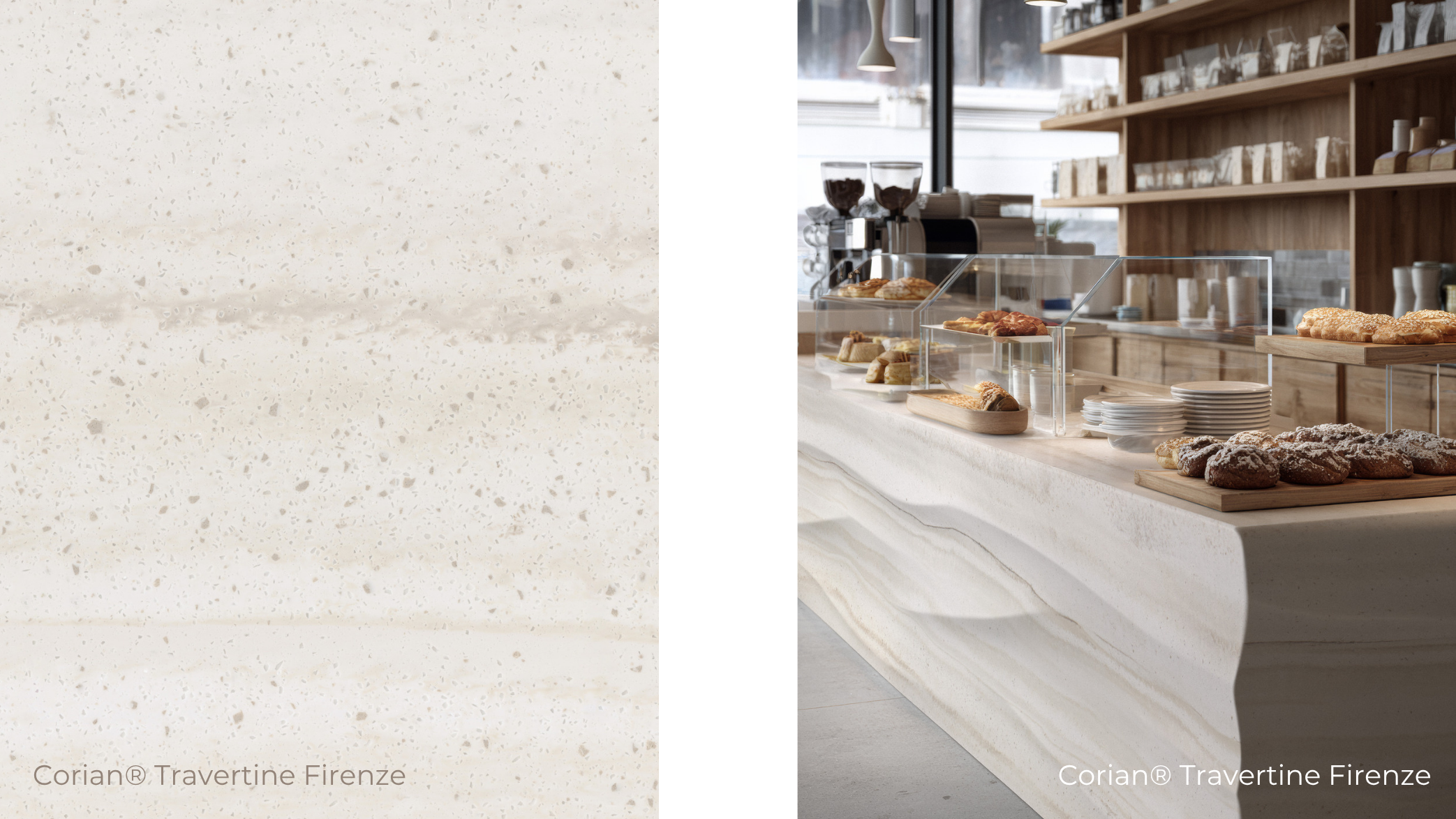 Trwały i elegancki, Corian® Travertine Firenze ukazuje płynny ruch ciepłych szarości na spokojnym, neutralnym tle. To ponadczasowa interpretacja designu, odzwierciedlająca złożoność natury i jej nieustanną ewolucję.